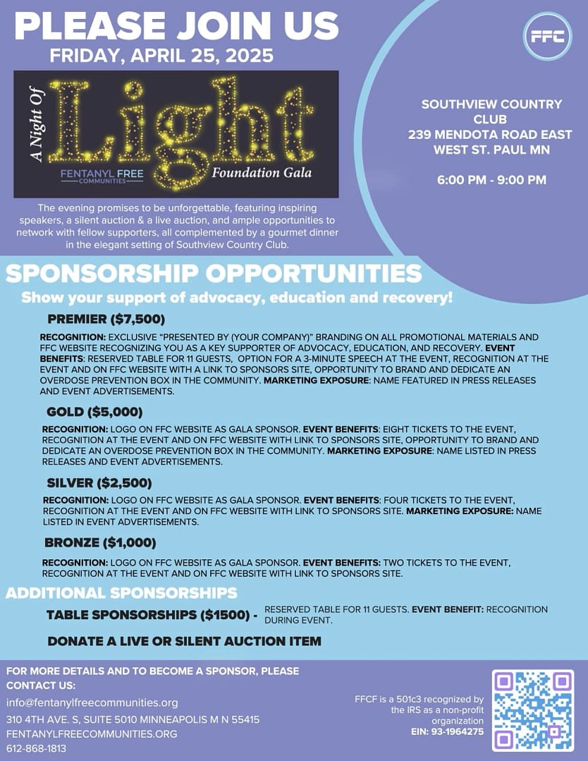 Interested in becoming a sponsor for the Fentanyl Free Communities Foundation Gala? Your support can make a real difference in the fight against the fentanyl crisis. We offer various sponsorship levels, each with its own set of benefits and recognition opportunities. Learn more about our sponsorship packages and join us in our mission to create safer, informed communities.